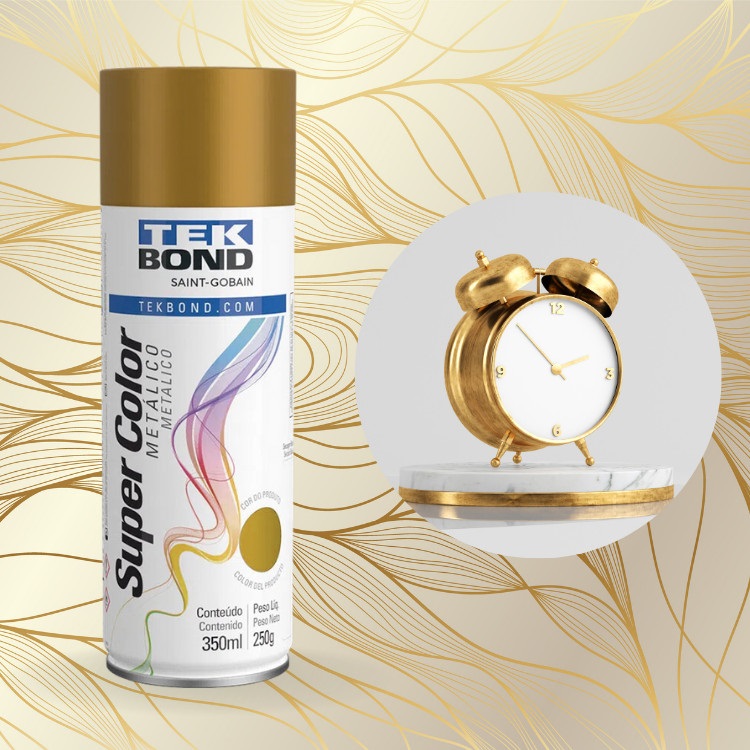 A Tinta Spray Tekbond Ouro Metálico 350ml é indicada para pintura de superfícies como metais, madeiras, cerâmicas, gesso e plásticos devidamente preparados. Proporciona excelente cobertura, secagem rápida e acabamento metálico brilhante, sendo ideal para uso em projetos de decoração, manutenção e reparos em geral.